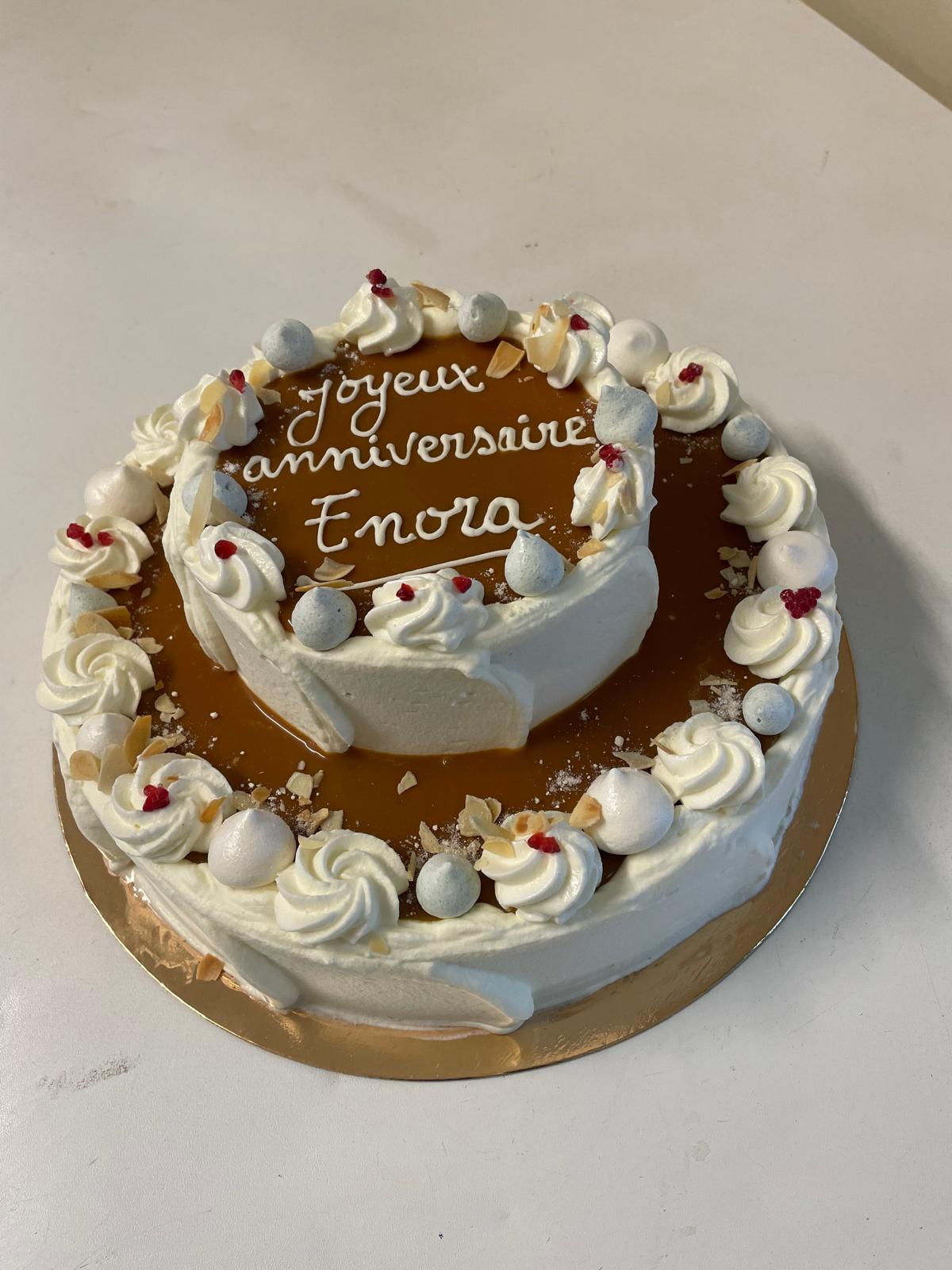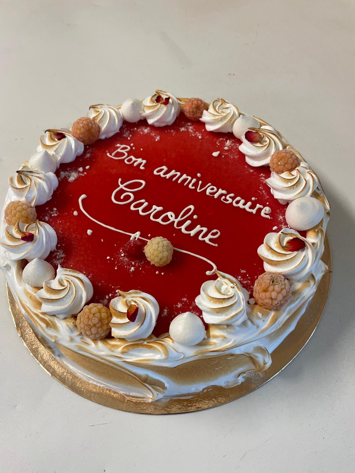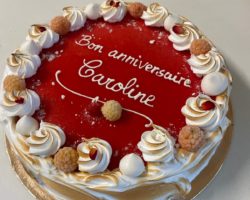 - Meringue italienne (meringue moelleuse et flambée) en remplacement de la garniture crème fraîche : 7,00€ (uniquement pour des gâteaux d’au moins 24 personnes).